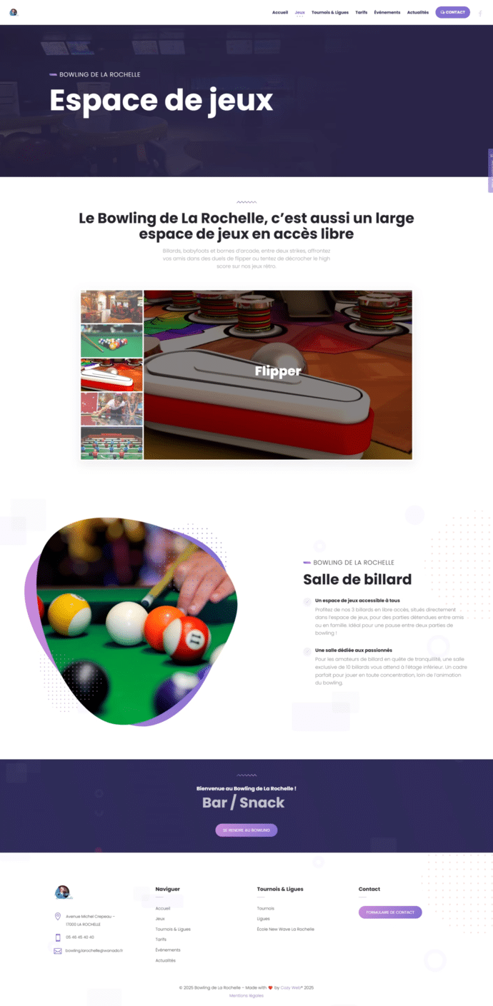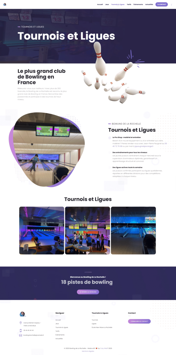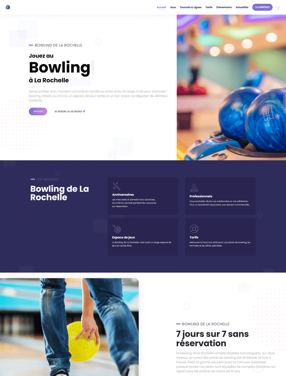 Un site vitrine conçu pour refléter l’ambiance fun et conviviale du bowling, tout en facilitant l’accès aux infos essentielles.