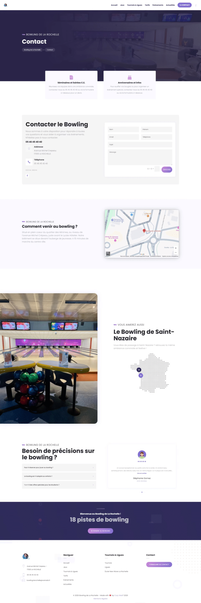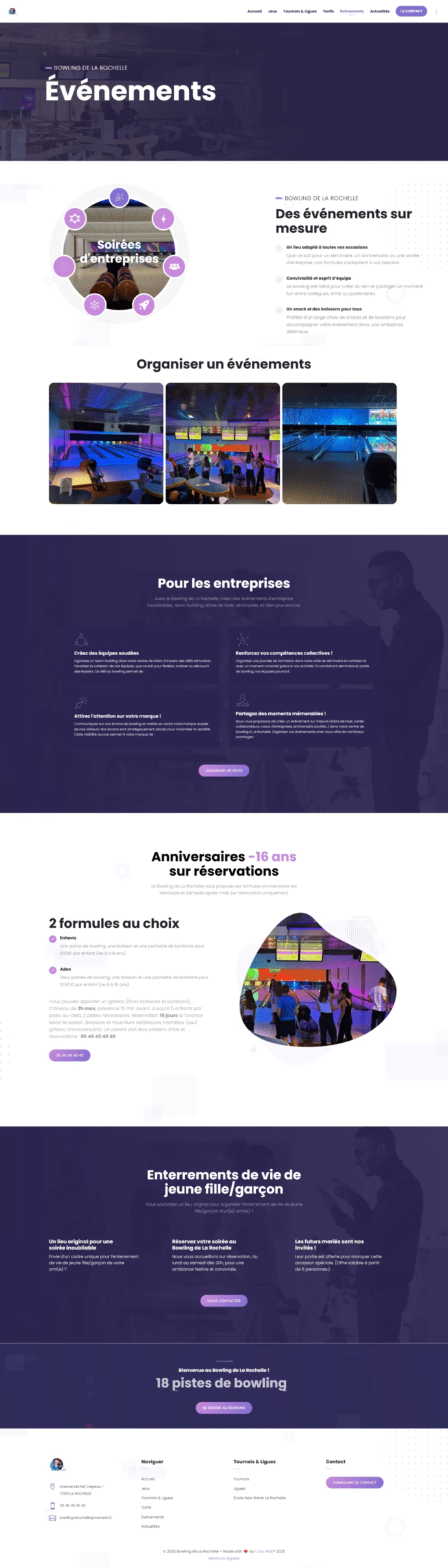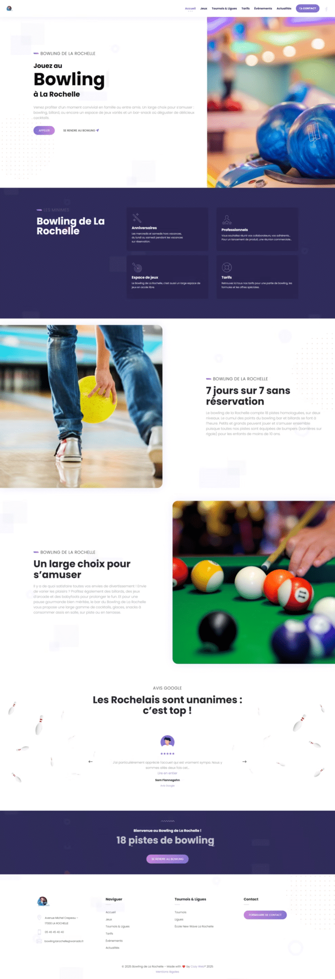 Un site vitrine conçu pour refléter l’ambiance fun et conviviale du bowling, tout en facilitant l’accès aux infos essentielles.